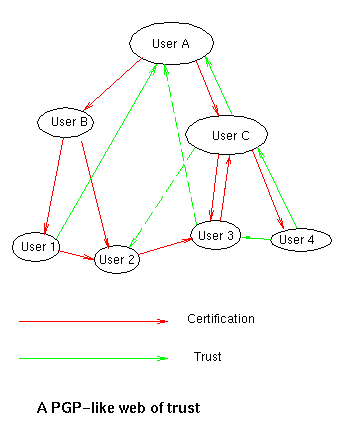 In such a mesh, user 1 may trust user B's identity because user A has certified it; user 3 has only limited faith in user B's identity because his trust in user A is not so strong, and will wait for corroboration from user 2 before trusting in B's identity.